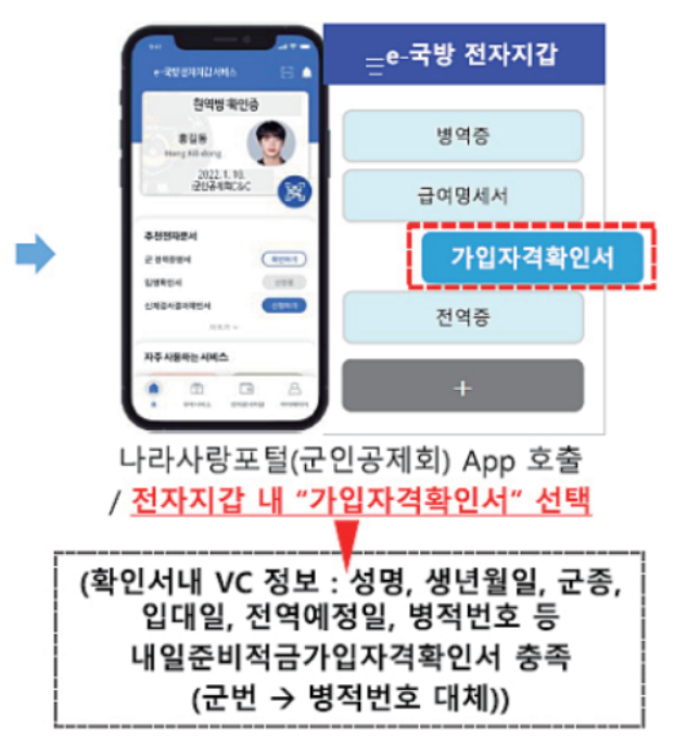 위 내용의 불편한 사항을 개선하여, <가입자격확인서 메일링서비스> 를 시행하게 되었습니다. 바로 가입자가 <나라사랑 포털 앱> 을 통해서, 가입자격확인서를 곧바로 발급받도록 조치하였다네요.