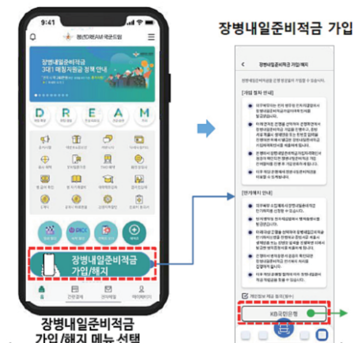 상근을 포함한 현역병을 대상으로, 직접 은행을 방문하지 않고, 군인공제회를 이용한 비대면 온라인으로 가입과 해지를 하도록 은행과 연계하는 서비스입니다.